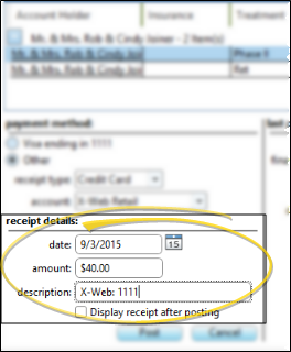 Before posting the payment, enable the Display receipt after posting option at the bottom of the window. This option is for non-credit card receipts only: A receipt is always generated for credit card payments whether or not this option is enabled.