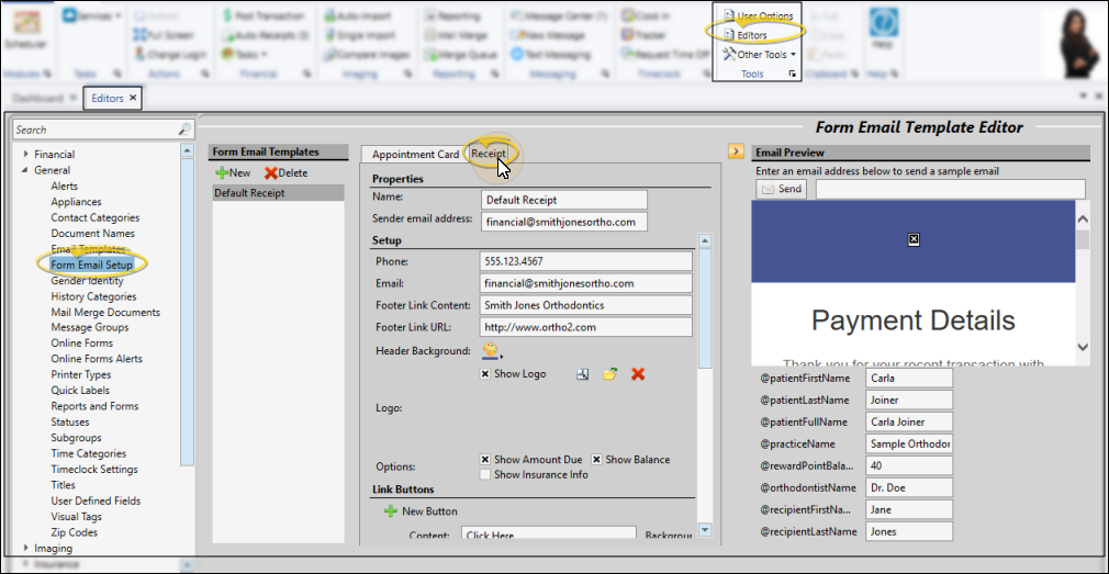 Use the Form Email Setup editor to create and manage appointment cards and payment receipts that you email to your patients and responsible parties. See "Form Email Setup Editor" for details.