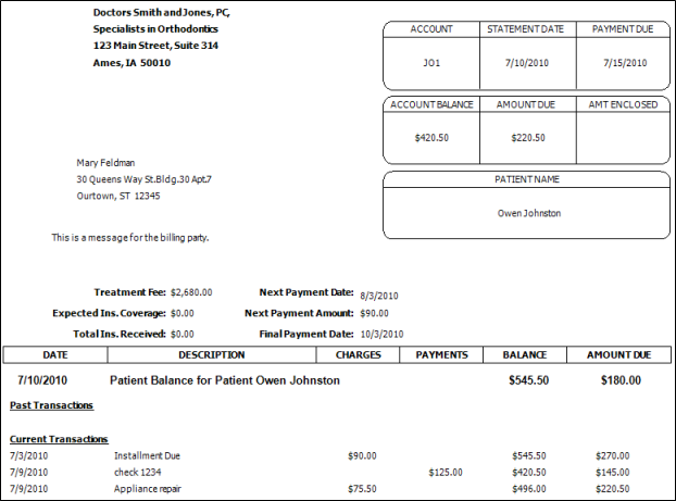 If you have Edge Specialist, this statement format is generally used for your orthodontics contracts and miscellaneous charges. To run this form from the Patient or Home ribbon bar, be sure that Statement is the default statement for your Orthodontics specialty in the Report and Forms editor, and that the orthodontics specialty is selected in the patient folder header.