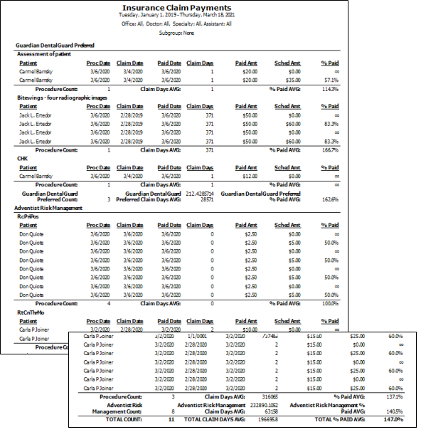Run an Insurance Claim Payments report to obtain a list of the payment details regarding the dental procedure fees submitted on your patients' pediatric dentistry insurance claims. The report is grouped by insurance company. Each insurance company section includes the dental procedures submitted, the service, claim, and payment dates, and the number of days elapsed between the claim and payment dates. Also included are the actual payment amount, the scheduled (or expected) amount, and percentage of the expected claim that was paid. The bottom of each procedure section includes a summary of that procedure for that insurance company, and the bottom of each insurance company section includes a summary for that company. A summary of all procedures for all insurance companies appears at the end of the report. You can run the report for any range of dates, and choose to include all dental procedures or only specific procedures.