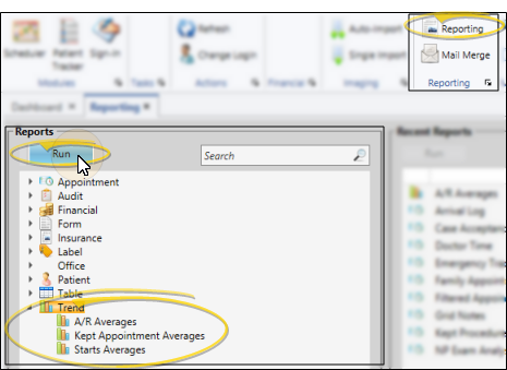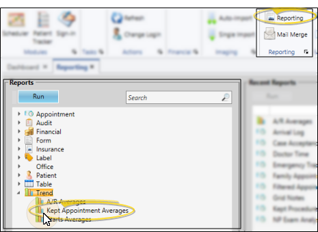Select Reporting from the Reporting section of the Home ribbon bar. Then from the Trend section, open the Kept Appointment Averages report. You can double-click the report name, or click Run at the top of the window to continue.(You can also use the Search field to find the report you want to work with.) You might also be able to run this report from your Recent Reports or Quick Reports list. See "Run Edge Cloud Reports" for details.