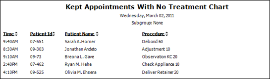 Kept Appointments with No Treatment Chart - This report prints patients who kept their appointments on a specific date, but have no treatment chart record created for that appointment yet.