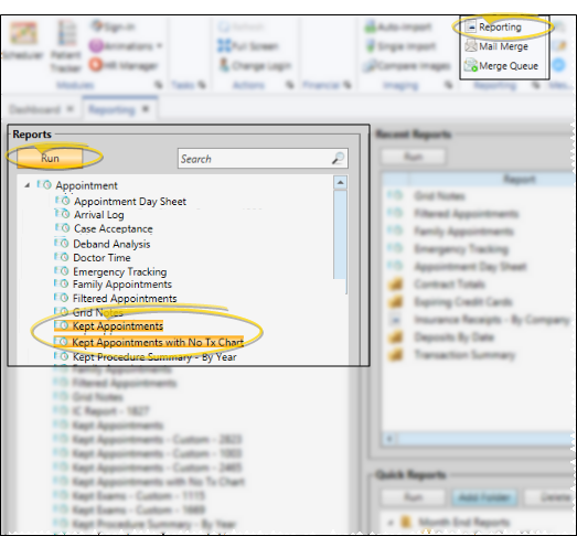 - Home ribbon bar > Reporting section > Reporting > Appointment > Kept Appointments or Kept Appointments with no Treatment Chart > Run. (You can also use the Search field to find the report you want to work with.) You might also be able to run this report or form from your Recent Reports or Quick Reports list. See "Run Edge Cloud Reports" for details.