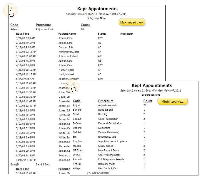 Kept Appointments - This report prints details the patients who kept their appointments during the date range you select. In addition to other report options, you can choose to include only certain types of procedures, only the patients assigned to a specific office or orthodontist, and optionally include patient alerts on the report. You can minimize the report to show a simple summary of the number of each type of procedure have been kept, or maximize the report to show details about each patient appointment.