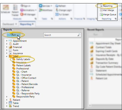 Select Reporting from the Reporting section of the Home ribbon bar. Then from the Label section, open the Family Label. (You can also use the Search field to find the label you want to work with.) You might also be able to run this label from your Recent Reports or Quick Reports list. See "Run Edge Cloud Reports" for details.