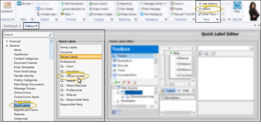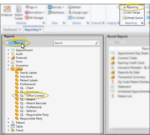 Select Reporting from the Reporting section of the Home ribbon bar. Then from the Label section, open the QL-Office Contacts label. (You can also use the Search field to find the label you want to work with.) You might also be able to run this label from your Recent Reports or Quick Reports list. See "Run Edge Cloud Reports" for details. Then choose the office contact to print for. These labels print on single-column label paper.
