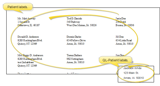 QL Patient Labels - When you print QL- Patient labels from the Reporting window, you may choose a specific patient to print for, or select a subgroup. If you do not select either a patient or a subgroup, no labels will be printed. These labels print on single-column label paper.