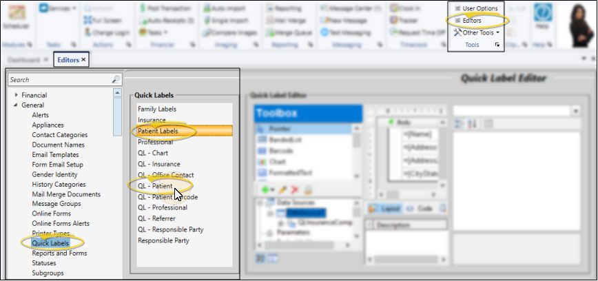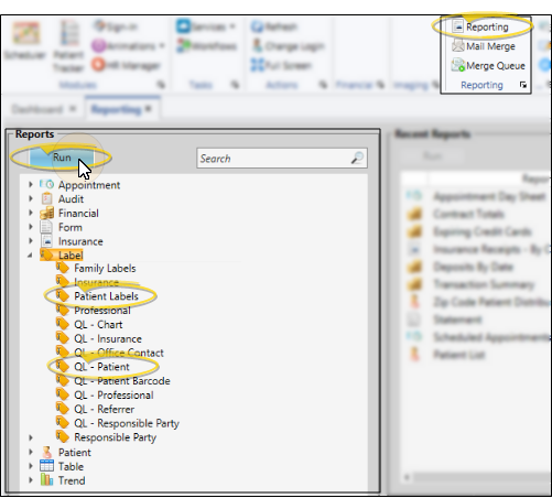 Select Reporting from the Reporting section of the Home ribbon bar. Then from the Label section, open the Patient Labels label to print mailing labels, or QL-Patient label to print quick labels. (You can also use the Search field to find the label you want to work with.) You might also be able to run this label from your Recent Reports or Quick Reports list. See "Run Edge Cloud Reports" for details.