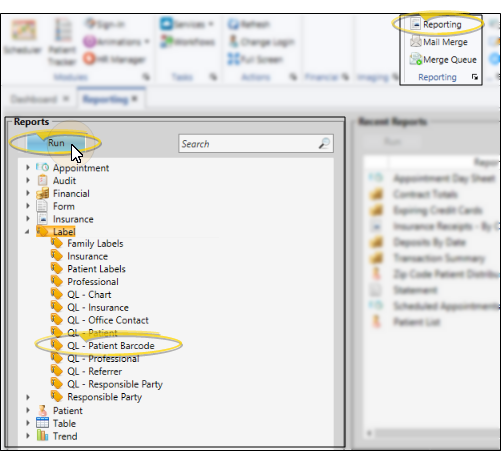Select Reporting from the Reporting section of the Home ribbon bar. Then from the Label section, open the QL-Patient Barcode label. (You can also use the Search field to find the label you want to work with.) You might also be able to run this label from your Recent Reports or Quick Reports list. See "Run Edge Cloud Reports" for details.