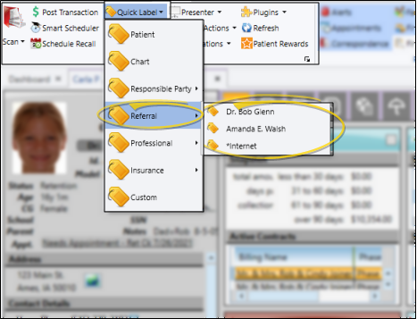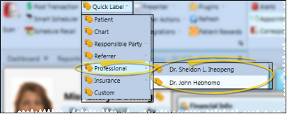 If the professional is also a referral source, you can print a referrer quick label for them from the referred patient's ribbon bar. See "Referrer Labels" for details.