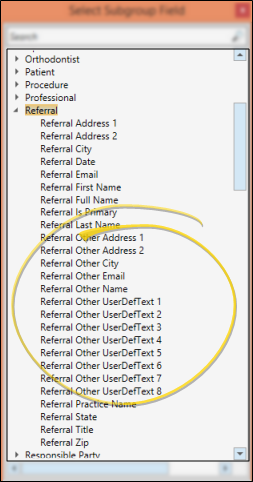 When you print QL- Referral labels, you may choose a specific party from your Other Referrer editor, or select a subgroup. If you do not select either an individual referrer or a subgroup, no labels will be printed. These labels print on single-column label paper.