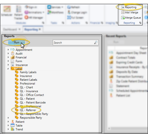 You can print labels for one or more referral sources listed in your Other Referrer editor from the Reporting window. Select Reporting from the Reporting section of the Home ribbon bar. Then from the Label section, open the QL-Referrer label. (You can also use the Search field to find the label you want to work with.) You might also be able to run this label from your Recent Reports or Quick Reports list. See "Run Edge Cloud Reports" for details. These labels print on single-column label paper.