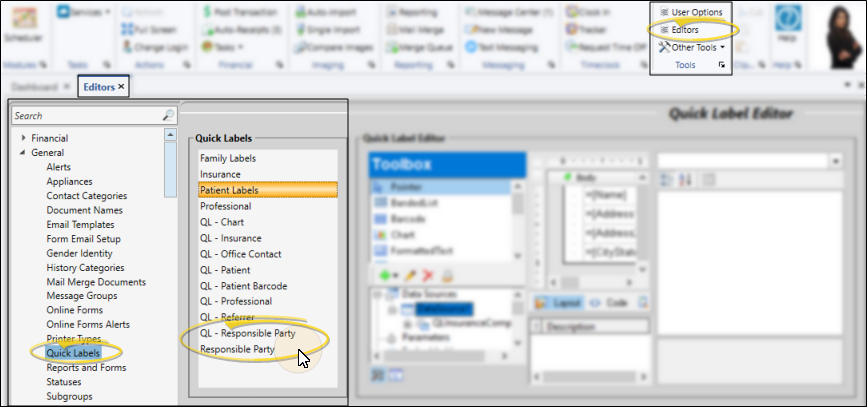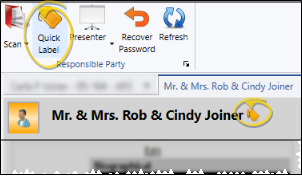 Open the patient folder and click the Quick Label icon in the Patient ribbon bar. Then select the responsible party to print for. The contents of this label is the same as the "QL" label available from the Reporting window. These labels print on single-column label paper.