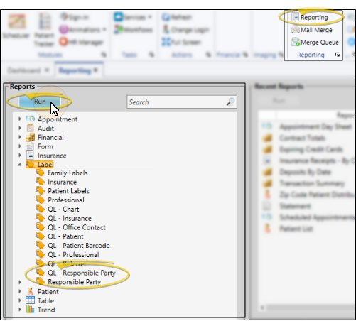 Responsible Party Labels - When you print Responsible Party mailing labels from the Reporting window, you may choose a subgroup to print for. If a patient has multiple responsible parties, a label will print for each party that fits your subgroup. If you do not choose a subgroup, a label will print for all responsible parties. These labels print 3-across on full-size label sheets.