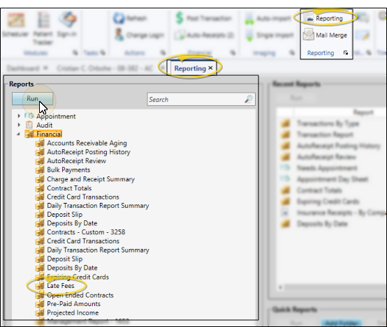 - Home ribbon bar > Reporting section > Reporting > Financial > Late Fees > Run. (You can also use the Search field to find the report you want to work with.) You might also be able to run this report from your Recent Reports or Quick Reports list. See "Run Edge Cloud Reports" for details.