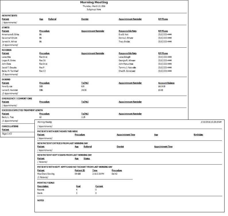 Run a Morning Meeting report to obtain quick access to key pieces of data that are useful for your morning meeting, including the types of procedures scheduled, upcoming birthdays, and progress toward your goals. Most offices run the report for today or tomorrow in preparation for the day.