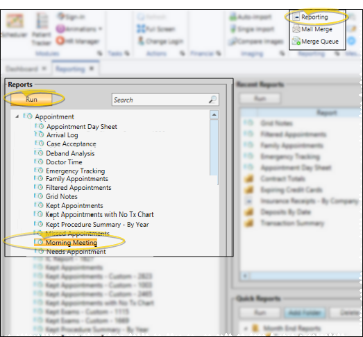 - Home ribbon bar > Reporting section > Reporting > Appointment> Morning Meeting > Run. (You can also use the Search field to find the report you want to work with.) You might also be able to run this report from your Recent Reports or Quick Reports list. See "Run Edge Cloud Reports" for details.