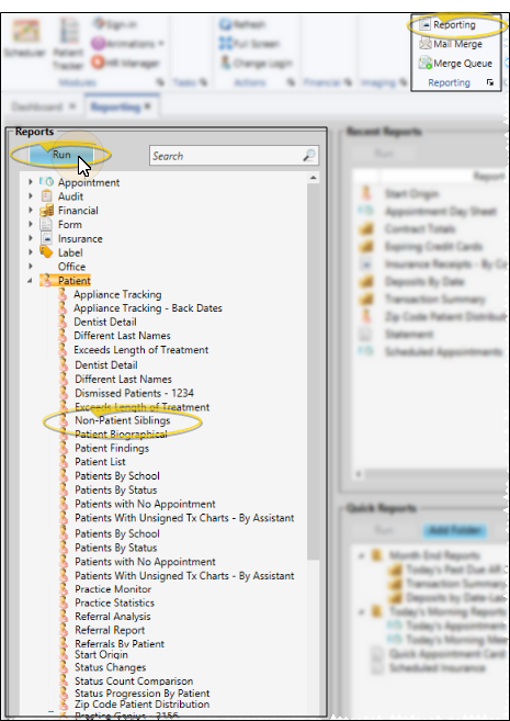 Select Reporting from the Reporting section of the Home ribbon bar. Then from the Patient section, open the Non-Patient Siblings report. You can double-click the report name, or click Run at the top of the window to continue.(You can also use the Search field to find the report you want to work with.) You might also be able to run this report from your Recent Reports or Quick Reports list. See "Run Edge Cloud Reports" for details.