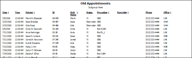 Run the Old Appointments report to see the list of patients whose scheduled appointment date has passed, and has not yet been processed from your scheduling grid. This might mean the patient missed the appointment, or that you simply have not yet processed it. The report is printed in chronological order (with the oldest missed / outstanding appointments appearing first), and includes the date, time, and procedure code that was scheduled, as well as the patient phone number. The report matches your Old Appointments scheduler bar.