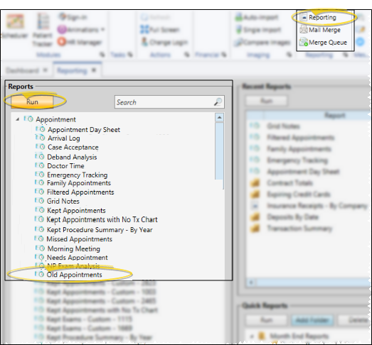 • Home ribbon bar > Reporting section > Reporting > Appointment > Old Appointments > Run. (You can also use the Search field to find the report you want to work with.) You might also be able to run this report from your Recent Reports or Quick Reports list. See "Run Edge Cloud Reports" for details.