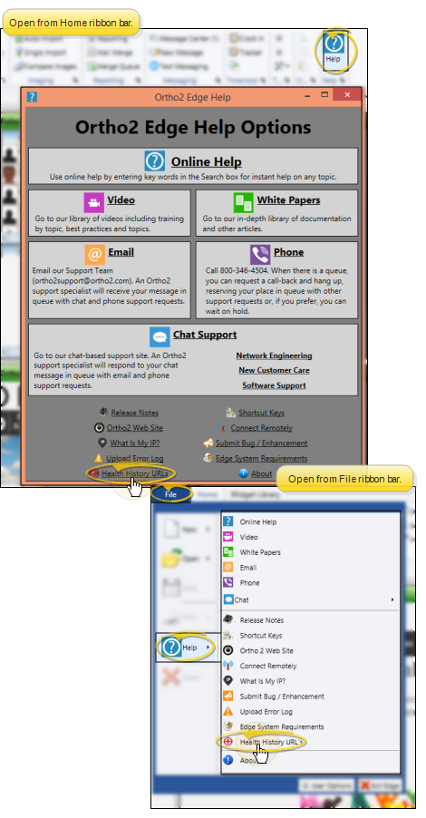 From the Edge Cloud Home or File ribbon bar, click the Help icon, then click Health History URLs.