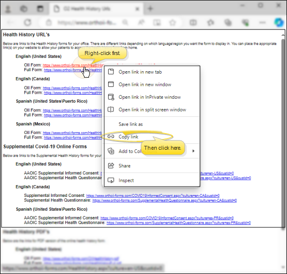 From the Ortho2 Health History URL web page, right-click the form you want to add to your web site, and select Copy Shortcut to obtain a copy of the complete URL. You can then add that link to your website, or include it in an email message.