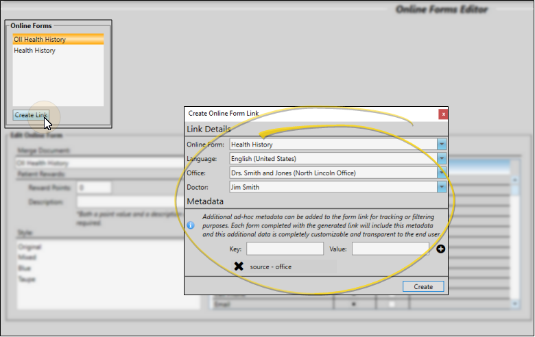 From the Create Link window, choose the online form, doctor, and office you want to work with. You can optionally create your own metadata key (i.e. "source") and value (i.e, "office") that you can use the track and filter submitted online forms. After entering a description in the Key and Value fields, click the "+" icon to add the metadata to the link. You can repeat the process to add as many metadata filters as you wish to the link. To remove metadata from the link, click the "X" beside the data to delete.