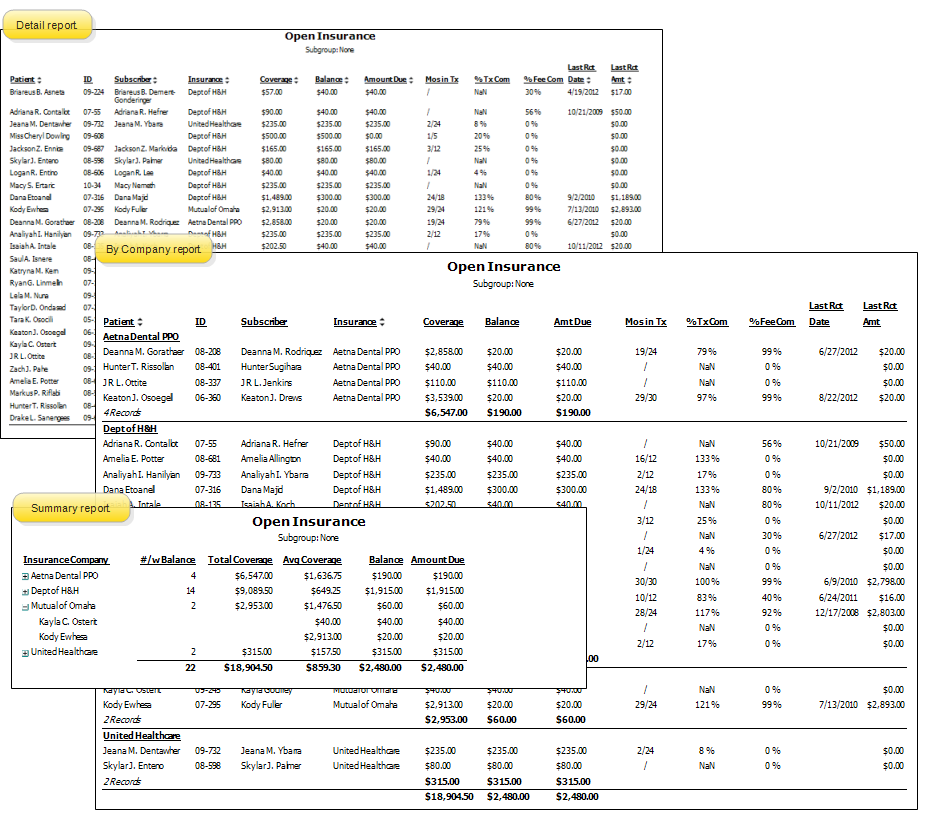 Run an Open Insurance report to obtain a list of insurance contracts with a balance greater than $0.00. Choose from the Detail report, which is sorted alphabetically by patient name; the Detail by Company report, which is sorted and subtotaled by insurance company, or the Summary report, which calculates the total insurance coverage, contract balance and amount due for each insurance company. The report will display 'E' next to the date if the insurance was submitted electronically.