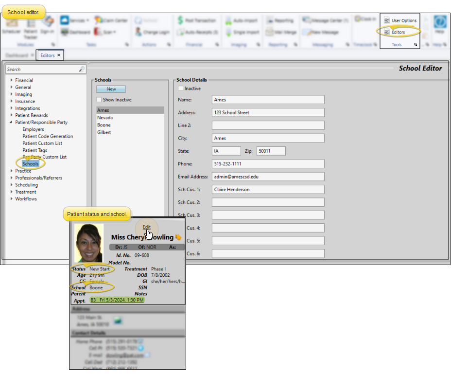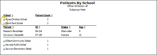 This report gets its data from the school and status assigned to the Patient Information Panel of the patient folder. You use the School editor to set up the list of schools your patients attend.