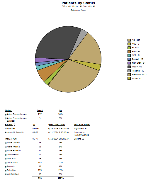 Run a Patients By Status report to obtain a pie chart and a list of your status descriptions, including the number and percentage of patients currently in each status. You may run the report for specific statuses, or include patients in all statuses in the report. You may choose to run the report for an individual doctor and/or office, or include all orthodontists and offices on the report. You can view the report with the results compressed, showing only the patient count and percentage, or click the "+" symbol to expand a status and show the patient details, including the next appointment information, if any.