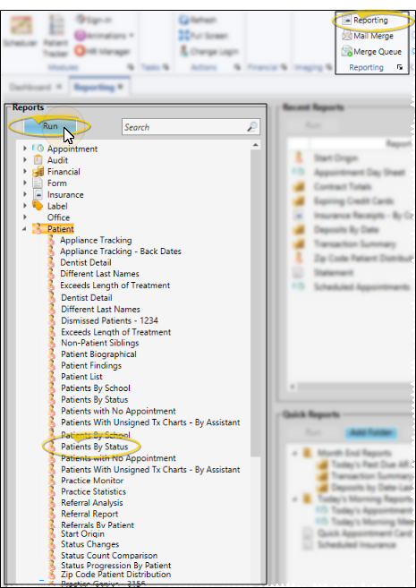 Select Reporting from the Reporting section of the Home ribbon bar. Then from the Patient section, open the Patients by Status report. You can double-click the report name, or click Run at the top of the window to continue.(You can also use the Search field to find the report you want to work with.) You might also be able to run this report from your Recent Reports or Quick Reports list. See "Run Edge Cloud Reports" for details.