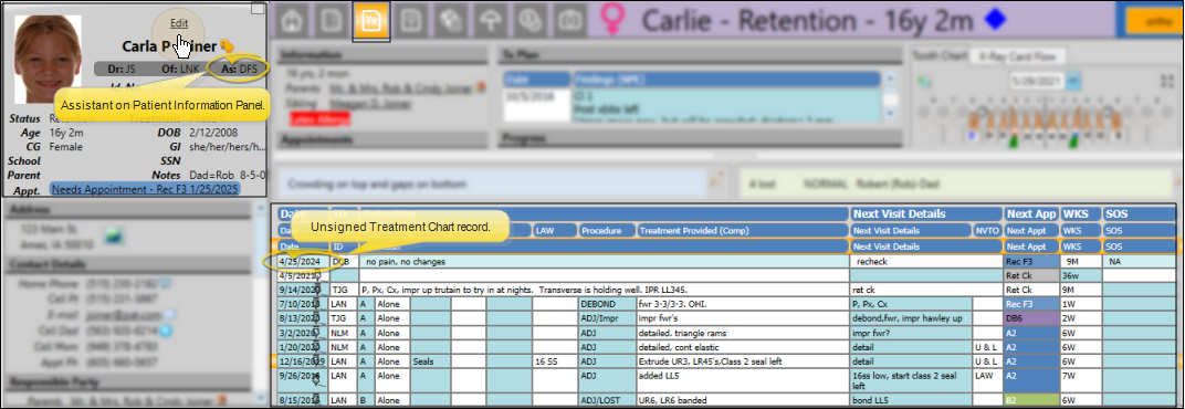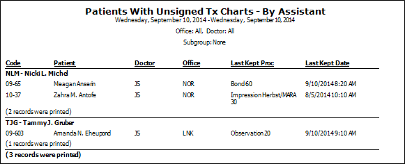 This report gets its data from the assistant assigned to the Patient Information Panel of the patient folder, which may not necessarily be the assistant that was assigned to the patient's most recent appointment, and unsigned records in the patient's Treatment Hub.