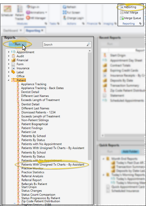 Select Reporting from the Reporting section of the Home ribbon bar. Then from the Patient section, open the Patients with Unsigned Tx Charts - By Assistant report. You can double-click the report name, or click Run at the top of the window to continue.(You can also use the Search field to find the report you want to work with.) You might also be able to run this report from your Recent Reports or Quick Reports list. See "Run Edge Cloud Reports" for details.