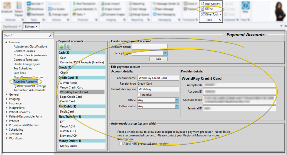 Use the Payment Accounts editor to define the types of payments you accept from responsible parties, such as checks, credit and debit cards, and electronic (ACH) payments. If you integrate Edge Cloud with an electronic payment processing system, such as Global Payments Integrated, Vanco, or Worldpay, you must create at least one payment account to use with that integration. See "Payment Accounts Editor" for details.