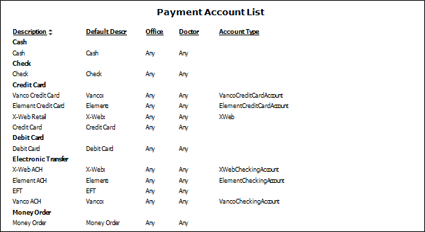 Run the Payment Account List to obtain a list of the payment accounts you use to accept payments for your practice. The report includes the transaction type category, default description, office and doctor assignment (if any), and account type.