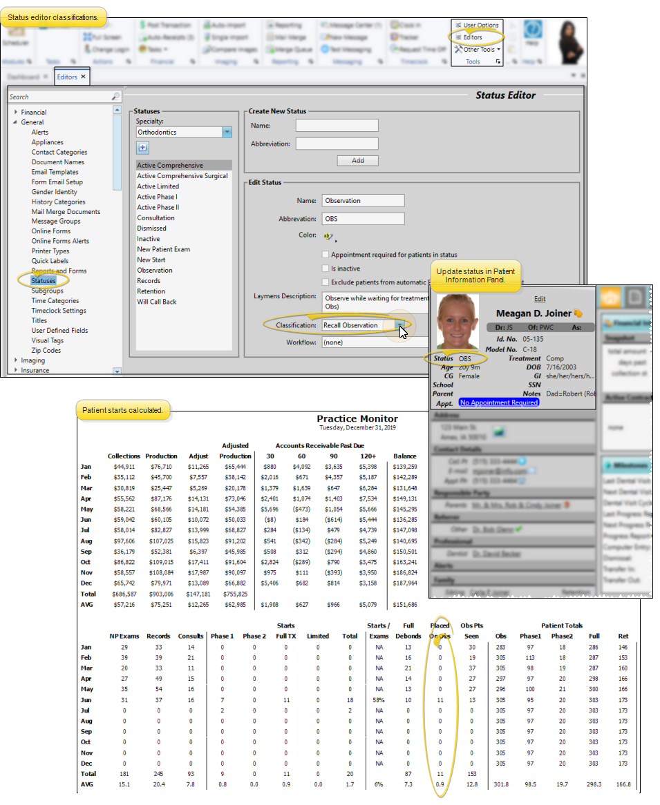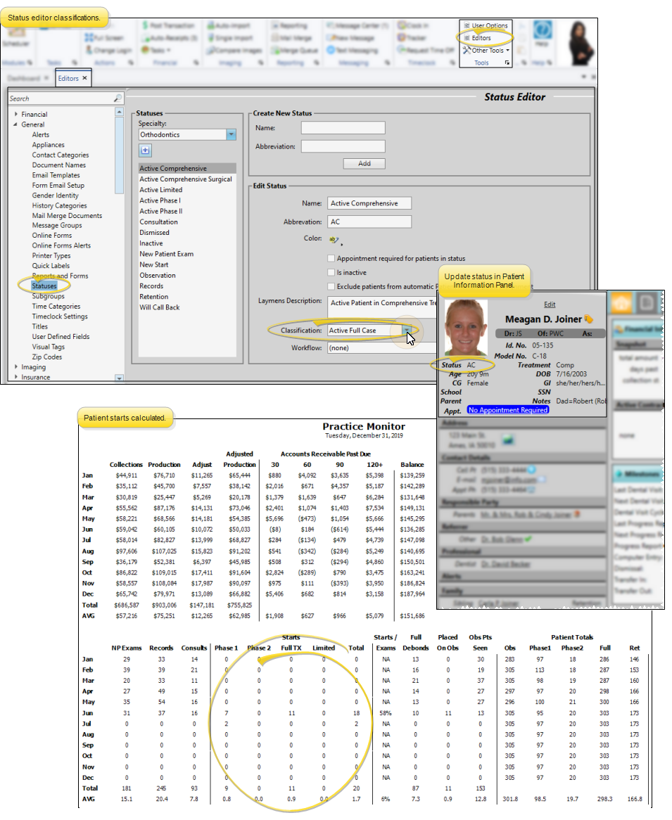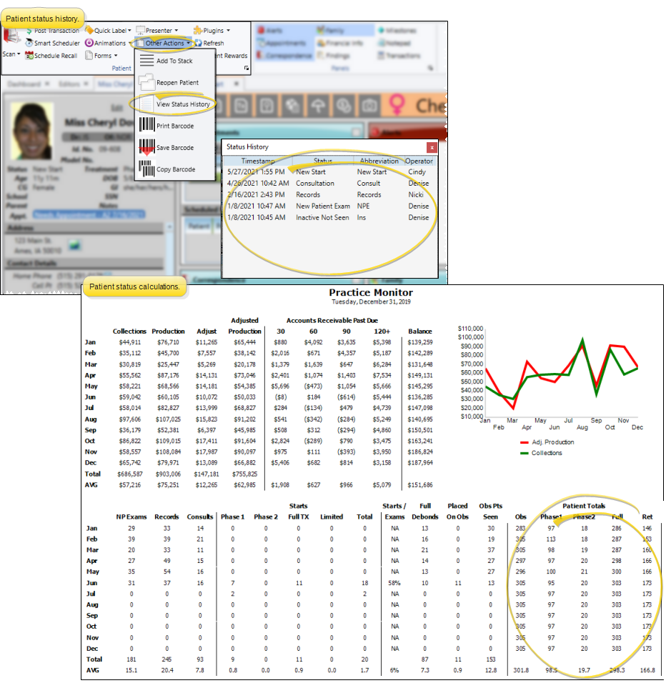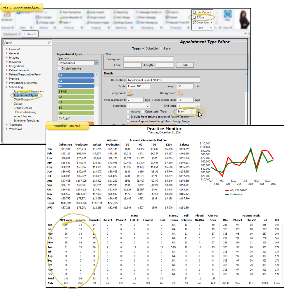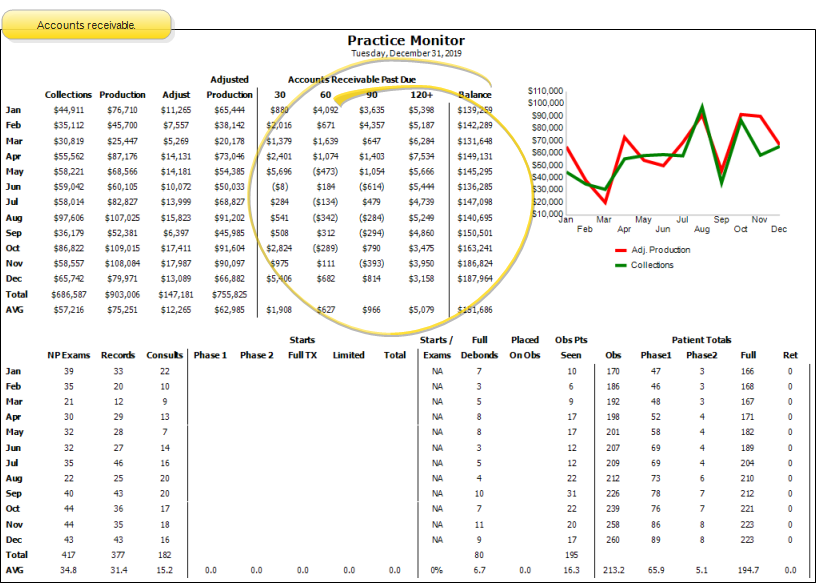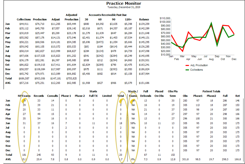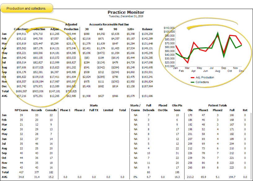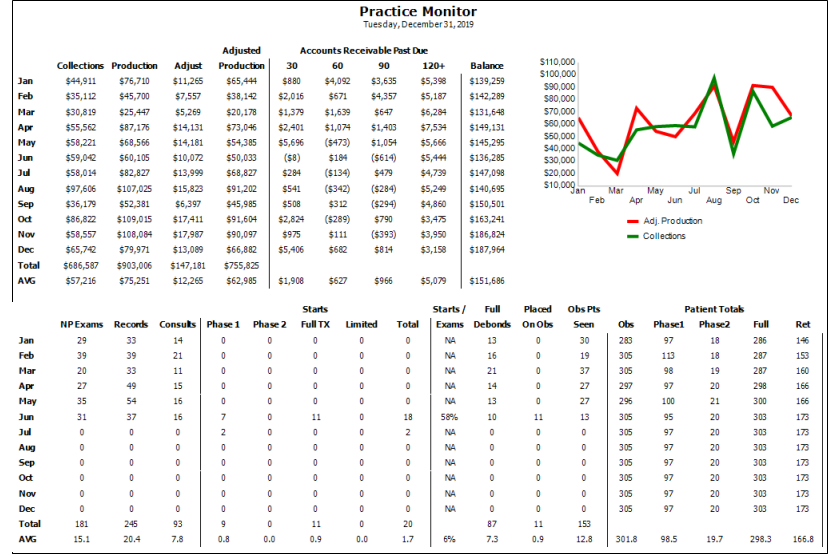 Run the Practice Monitor report to prepare a month-by-month profile of your practice production and receivables, including a chart of those results, as well as patient exam, start, and status data for all or part of any year. You may run the report for a specific orthodontist and/or office, or for all doctors and locations in your practice.