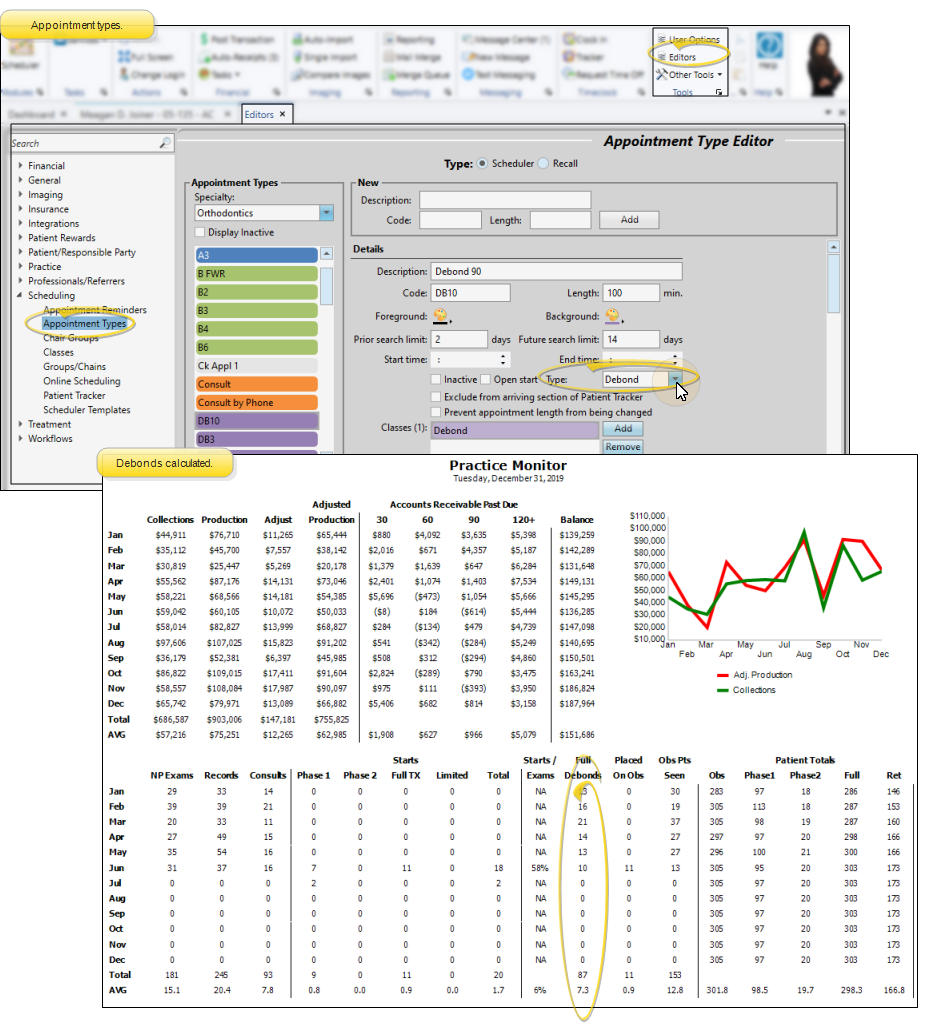 The Full Debonds column shows the number of patients that kept an appointment whose appointment "type" in the Appointment Procedure Types editor is "Debond". You must process patient appointments regularly for this data to be accurate.
