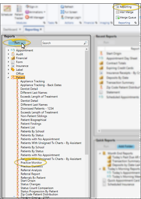 Select Reporting from the Reporting section of the Home ribbon bar. Then from the Patient section, open the Practice Monitor report. You can double-click the report name, or click Run at the top of the window to continue.(You can also use the Search field to find the report you want to work with.) You might also be able to run this report from your Recent Reports or Quick Reports list. See "Run Edge Cloud Reports" for details.