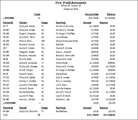 Run a Pre-Paid Amounts report to obtain a list of patients that have either overpaid their accounts, or have paid more than the current amount due on the balance of their account. The report can be viewed either in summary form, with all amounts totaled, or in detail form, listing each patient's data.