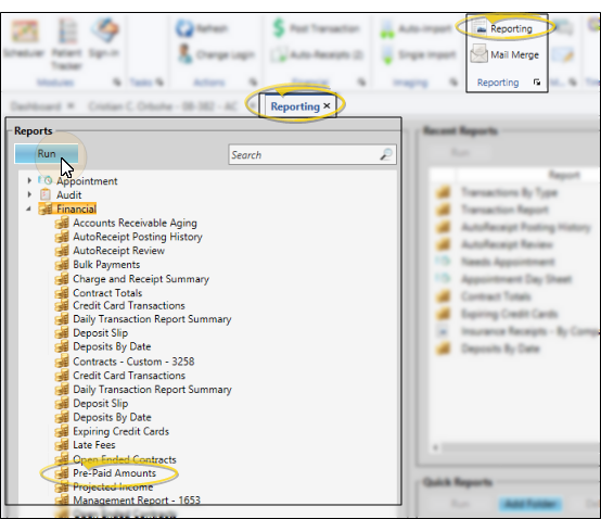 • Home ribbon bar > Reporting section > Reporting > Financial > Pre-Paid Amounts > Run. (You can also use the Search field to find the report you want to work with.) You might also be able to run this report from your Recent Reports or Quick Reports list. See "Run Edge Cloud Reports" for details.