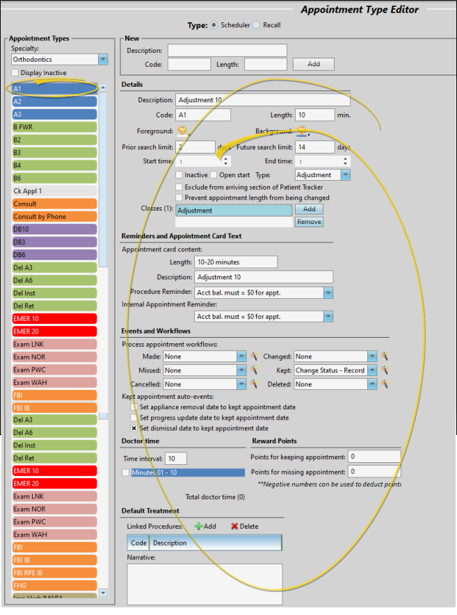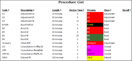 Run a Procedure List report to review the list of active appointment and recall procedures you have created for your patients. The grid cell colors you have chosen for each procedure are included on the report, so it is best to print it with a color printer. Procedures that can be scheduled as recalls are indicated with an "x" in the Recall column of the report. All other procedures are for regularly scheduled appointments. Only active records are included in the report: Any items flagged Inactive in the editor are omitted. If you have Edge Specialist, the records for both orthodontics and pediatric dentistry are included in the report.