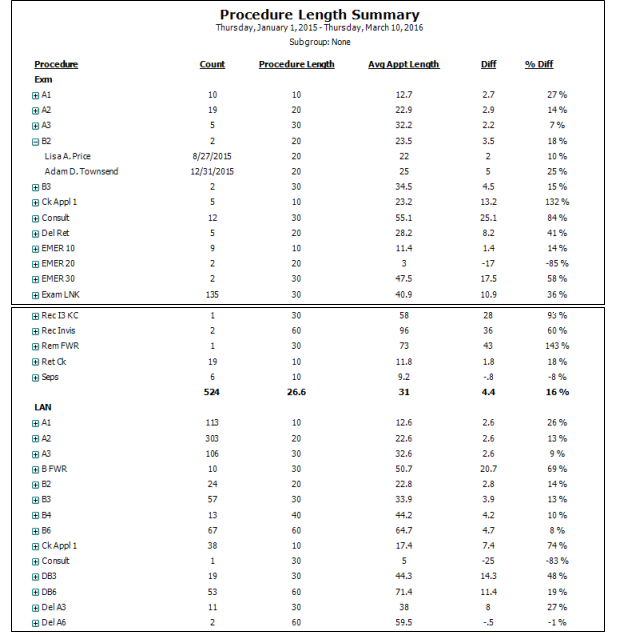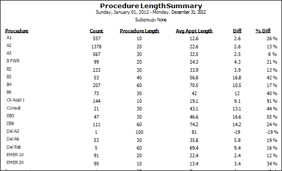 Run the Procedure Length Summary report to review the contrast between the amount of time you schedule for procedures with the time it actually takes to perform an appointment, according to the data you collect as you process patients through your Patient Tracker system.