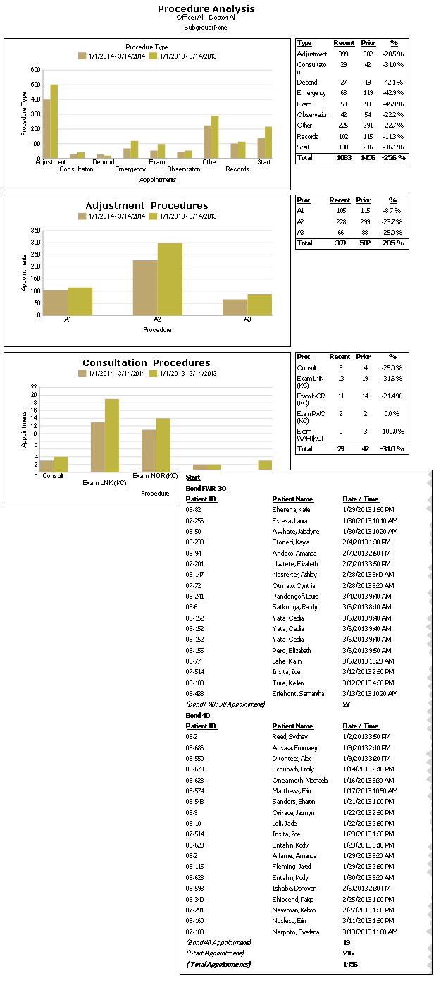 Run the Procedure Analysis report to obtain both statistical and graphical representation of kept appointments by procedure type for one or multiple date ranges. In addition to selecting the dates to include, you can choose to run the report for specific orthodontists or offices, and choose whether to include individual appointment details for each procedure.