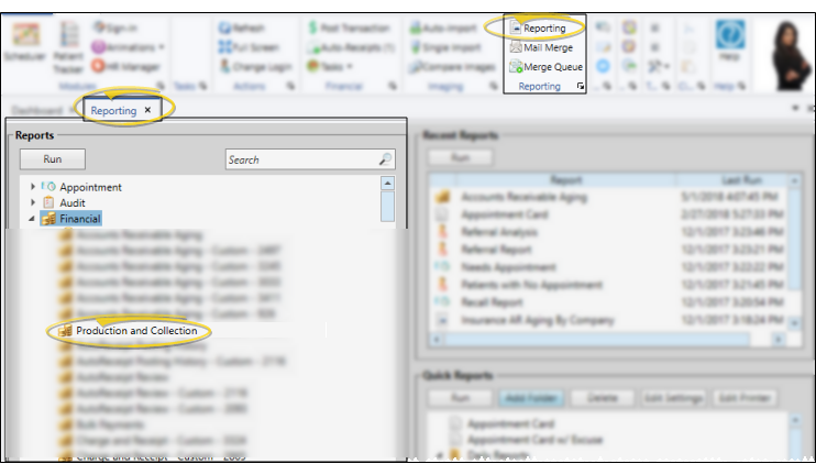 Open the Report - Select Reporting from the Reporting section of the Home ribbon bar. Then from the Financial section, open the Production and Collection report. You can double-click the report name, or click Run at the top of the window to continue. (You can also use the Search field to find the report you want to work with.) You might also be able to run this report or form from your Recent Reports or Quick Reports list. See "Run Edge Cloud Reports" for details.