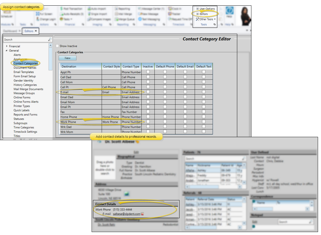 Use the Professional editor to create and maintain records for the consulting and treating professionals, such as oral surgeons, pedodontists, and periodontists, that work with your patients. Each record includes the professional's name, practice name, address, phone number, several user-defined fields, correspondence history, list of patient assigned to this professional, and a notepad you can use to add additional information. You can optionally include a photograph in each record. See "Create Professional Records" for details.