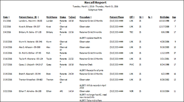 Run a Recall appointment report to obtain a list of patients with recall appointments during any range of dates. The report includes the patient name, nickname, status, procedure, phone number, office, doctor, and age.