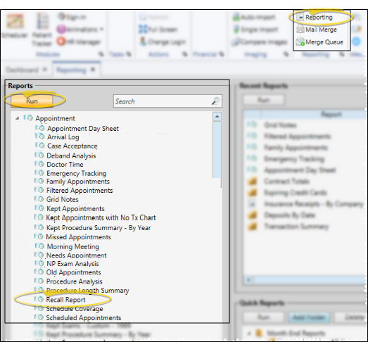 - Home ribbon bar > Reporting section > Reporting > Appointment > Recall Report > Run. (You can also use the Search field to find the report you want to work with.) You might also be able to run this report or form from your Recent Reports or Quick Reports list. See "Run Edge Cloud Reports" for details.