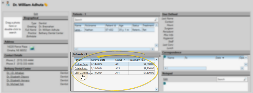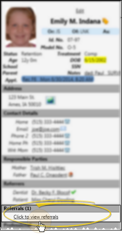 The Referrals panel of your Professional page lists the patients referred by that person.You can click a patient name to open that person's patient folder. See "Professional Records" for details.