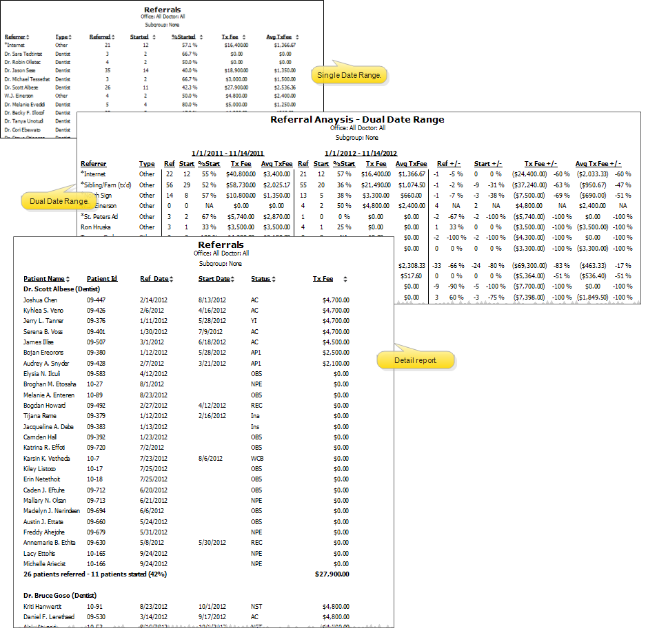Run a Referral report to obtain a list of referral sources and the patients they have referred to your practice. You can run the report for any range of dates according to the patients' referral date, entry date, start date, or exam date. The report can show just a summary of the data, or a detailed list of the patients referred within your time period. You can optionally group the referrers by practice name.
