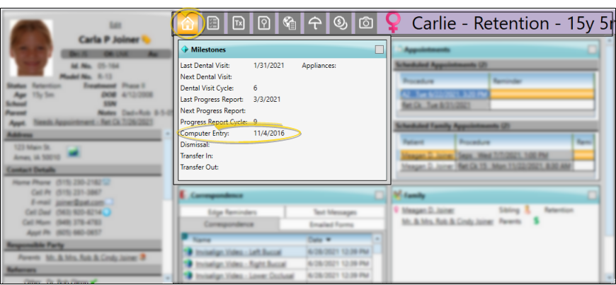 The patient's computer Entry Date is found on the Milestones panel of the patient Home page. This date cannot be changed.